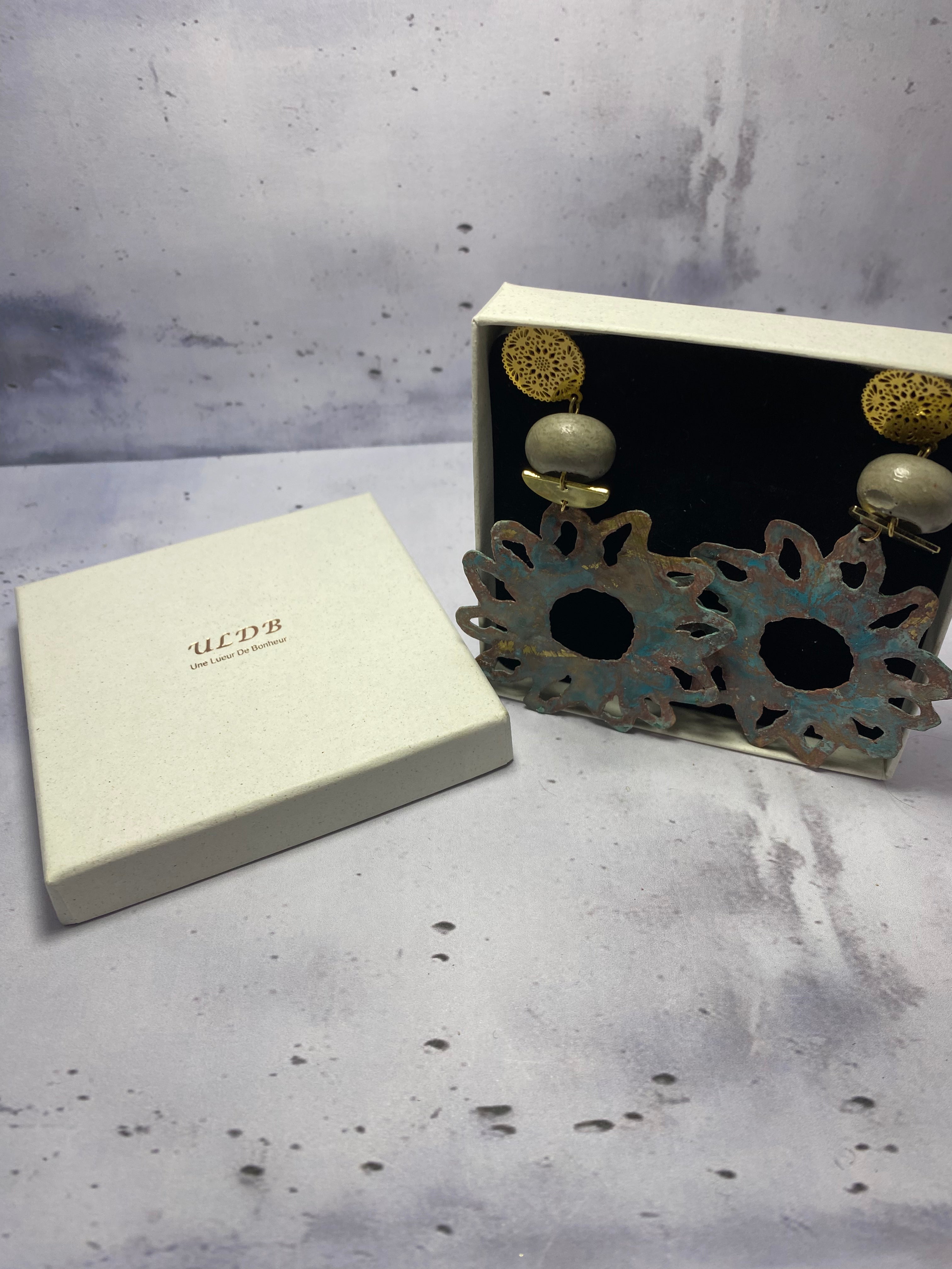Les Boucles Solarys associent inspiration solaire et matière brute dans un design fort et raffiné. Découpées au bocfil dans du laiton oxydé, elles dessinent une silhouette rayonnante en forme de soleil. Au-dessus de ce motif lumineux repose une perle de béton brut, qui apporte une touche minérale et moderne. Entièrement fabriquées à la main, ces boucles sont des pièces uniques, à la fois audacieuses et élégantes.