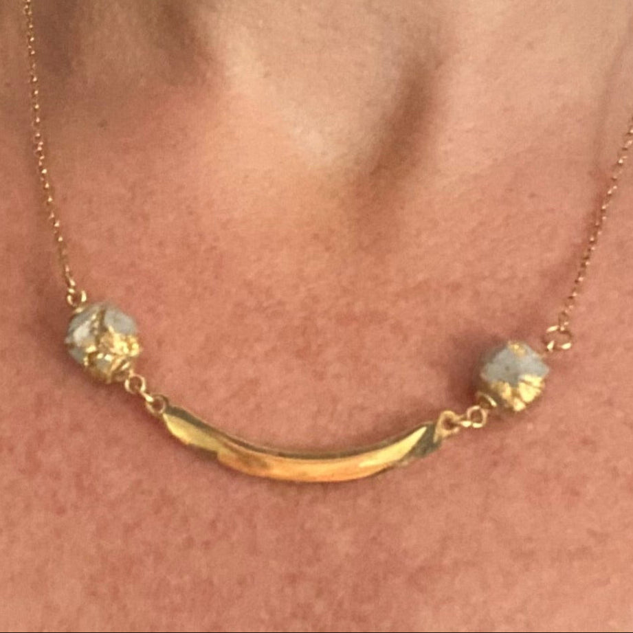 Le Collier B&B est une création artisanale qui allie modernité et poésie. Ce bijou unique se compose de deux étoiles en béton, reliées par une élégante plaque dorée qui agit comme un trait d’union symbolique. Une pièce pleine de caractère, qui marie subtilement la force brute du béton et la finesse lumineuse du doré.